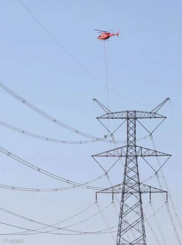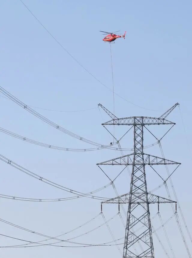 ↑直升机吊挂着电力工人飞往线路缺陷现场。