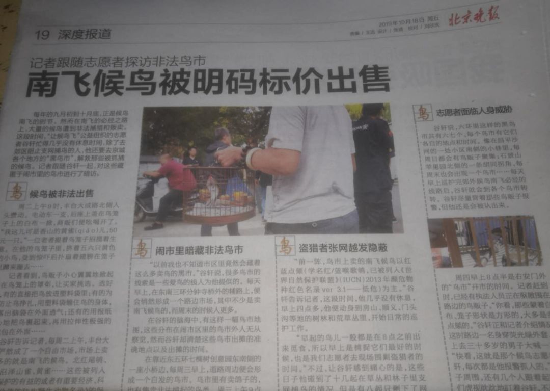 *由于迁徙期非法交易旺季与国庆重叠,小队联合媒体伙伴用前后三周的时间马不停蹄的走访调查了近10个非法鸟市交易现场,在国庆节假期结束后发布调查文章。调查报道引起主管部门重视,以此为导向开展秋季执法行动。