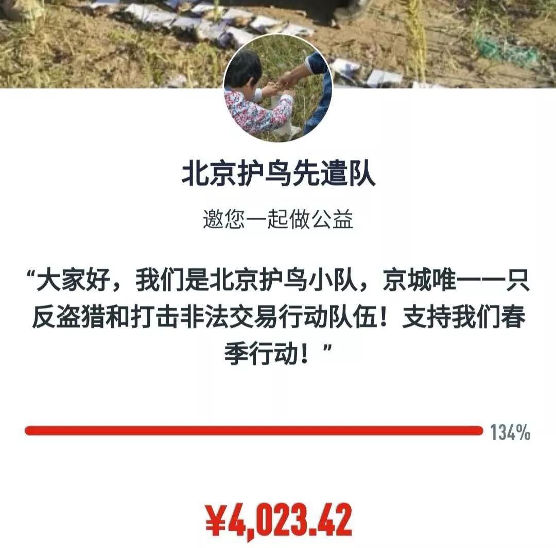 9月初藉由腾讯公益平台“九九公益日”发起了“北京护鸟先遣队”筹款项目,截止2019年年底,共有386位朋友捐助支持了北京护鸟小队行动资金共计16000余元(上半年北京护鸟项目筹集行动资金6023元),2019全年共筹集行动资金22000余元。