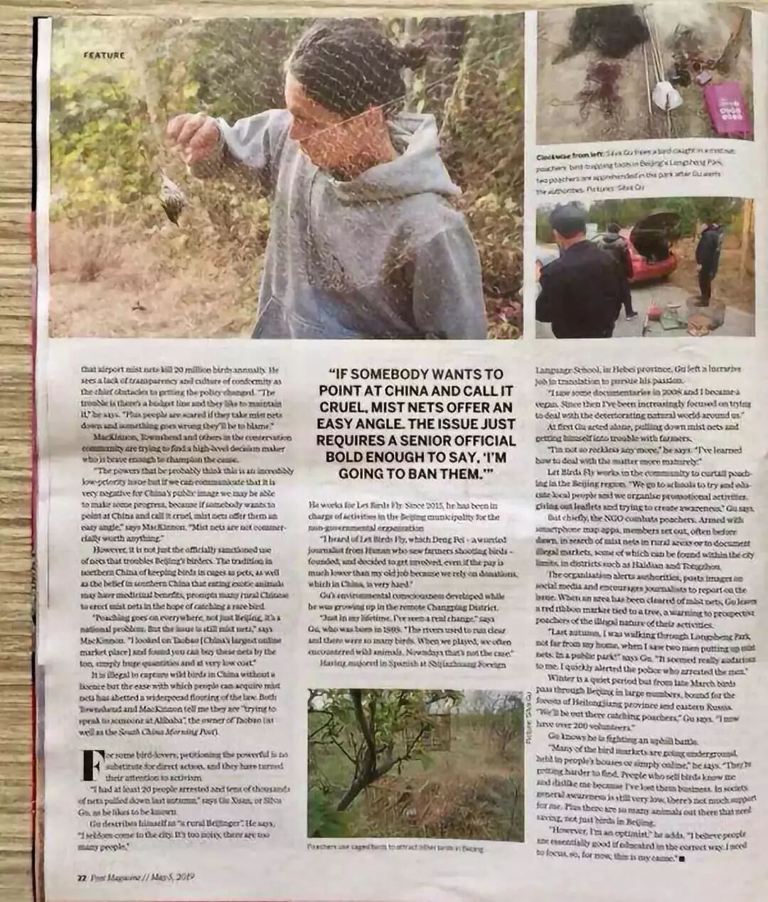 5月初北京护鸟项目接受香港南华早报(south china post)的采访,讲述介绍了北京护鸟小队在北京地区的护鸟行动和愿景,希望通过媒体伙伴的协助宣传能有更多人一起参与北京地区的生态保护和野生动物保护行动。