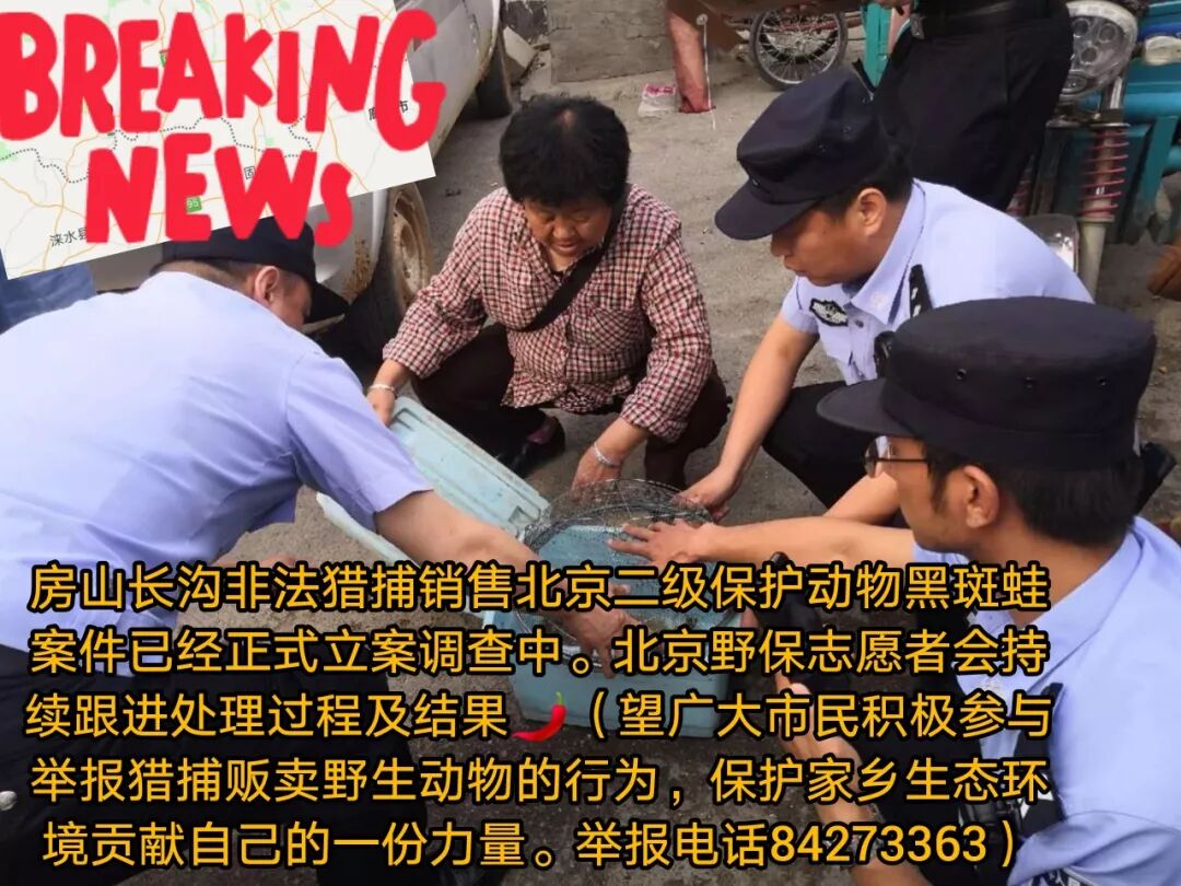 接到志愿者举报信息反应,在房山区长沟镇有人捕捉贩卖国家三有保护动物黑斑蛙,大家的关注就是我们的动力,接报后的第三天我们启程来到现场。在现场的志愿者配合下,我们很快在位于房山区长沟镇大桥的集市上发现违法贩卖黑斑蛙的摊位举报后,房山区森林公安处反应迅速抓获违法嫌疑人查扣野生黑斑蛙20余只,相关涉案人员被带回将依法作进一步调查处理。