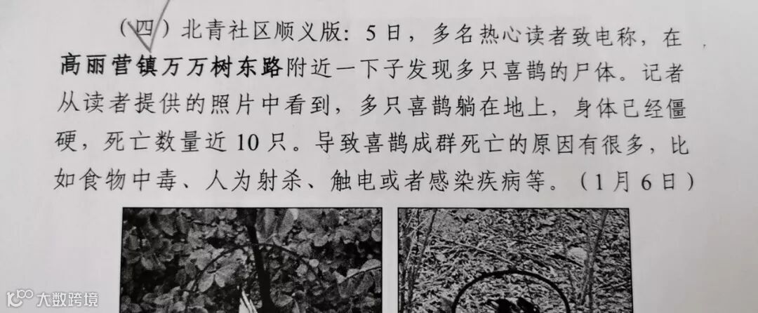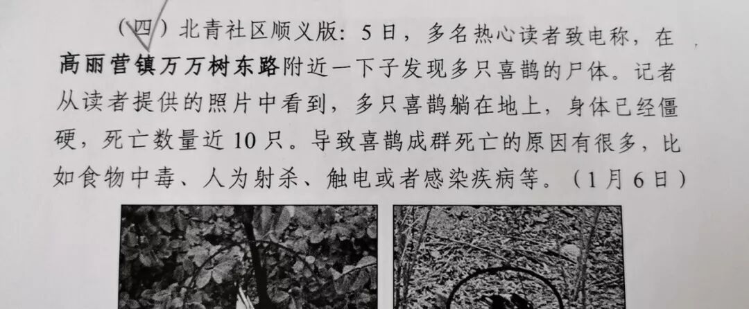 接到志愿者消息,在顺义区高丽营镇附近发现一小群喜鹊死亡的情况。北青报参与报道,顺义森林公安处和相关科室人员到场送检了死亡样本。