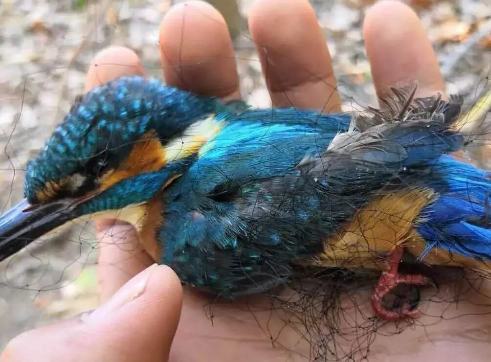 *被捕鸟网缠住的翠鸟,及时解救放飞成功