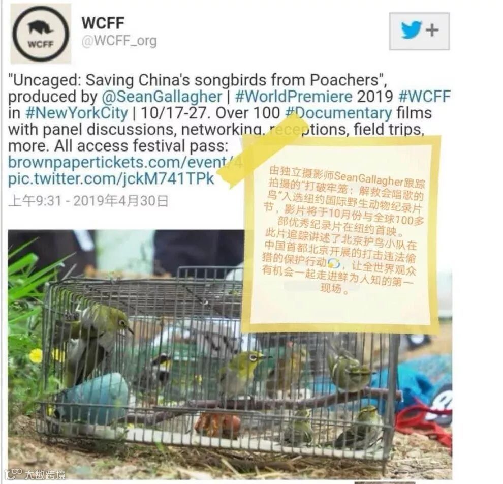 8月初得到消息,由国家地理纪录片导演拍摄讲述北京护鸟志愿者的保护行动“打开牢笼:与盗猎者搏斗”的10分钟纪录片入选国际野生动物纪录片节,将于10月份在纽约播映。