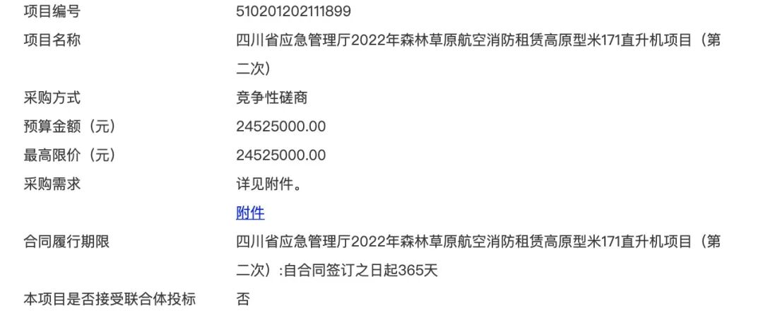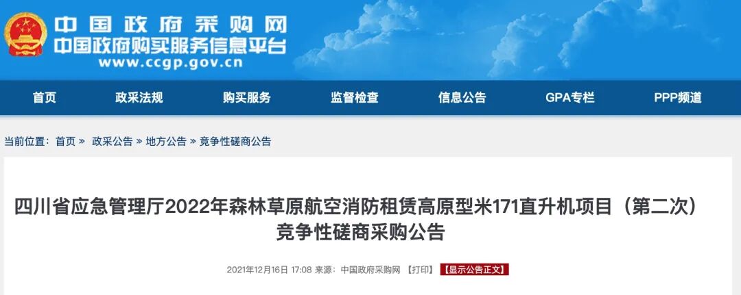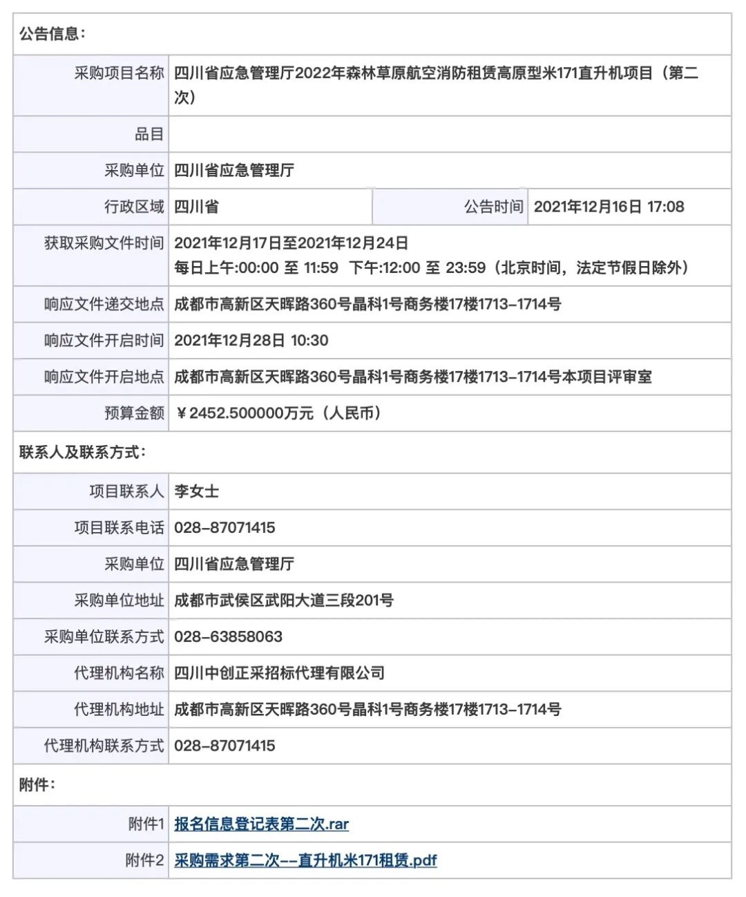 12月17日,中国政府采购网昨日公布《四川省应急管理厅2022年森林草原航空消防租赁高原型米171直升机项目(第二次)竞争性磋商采购公告》,详情如下: