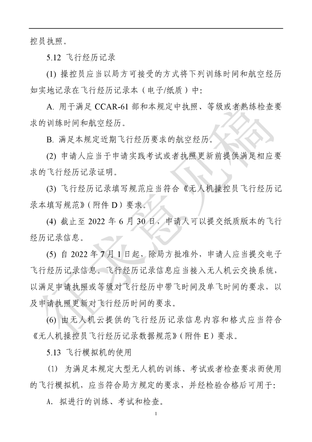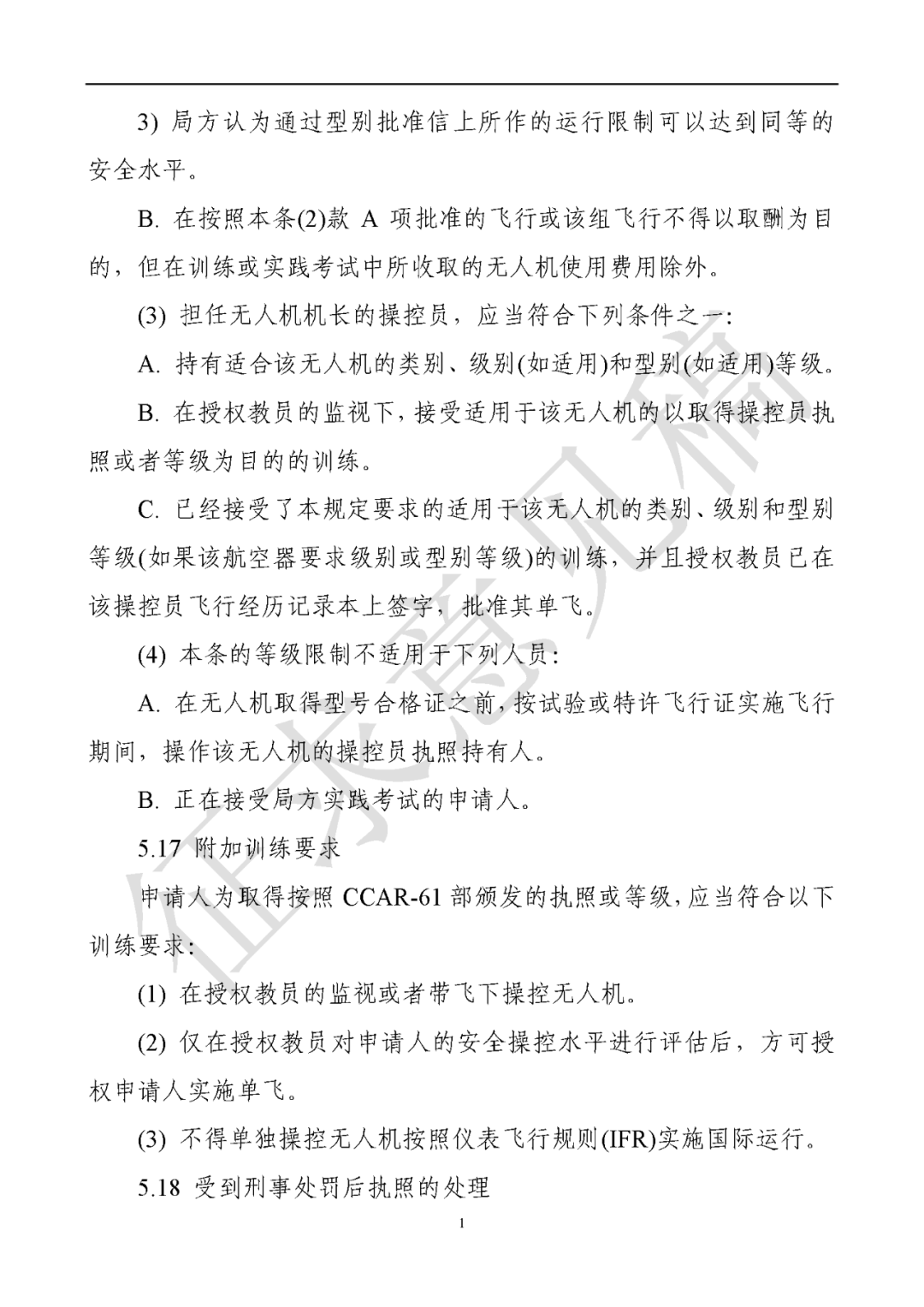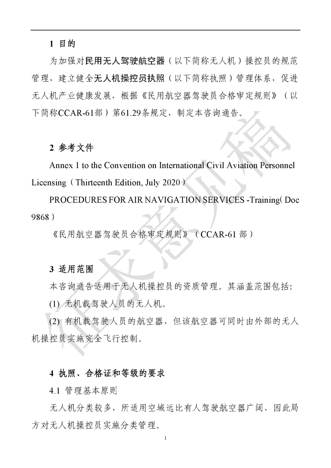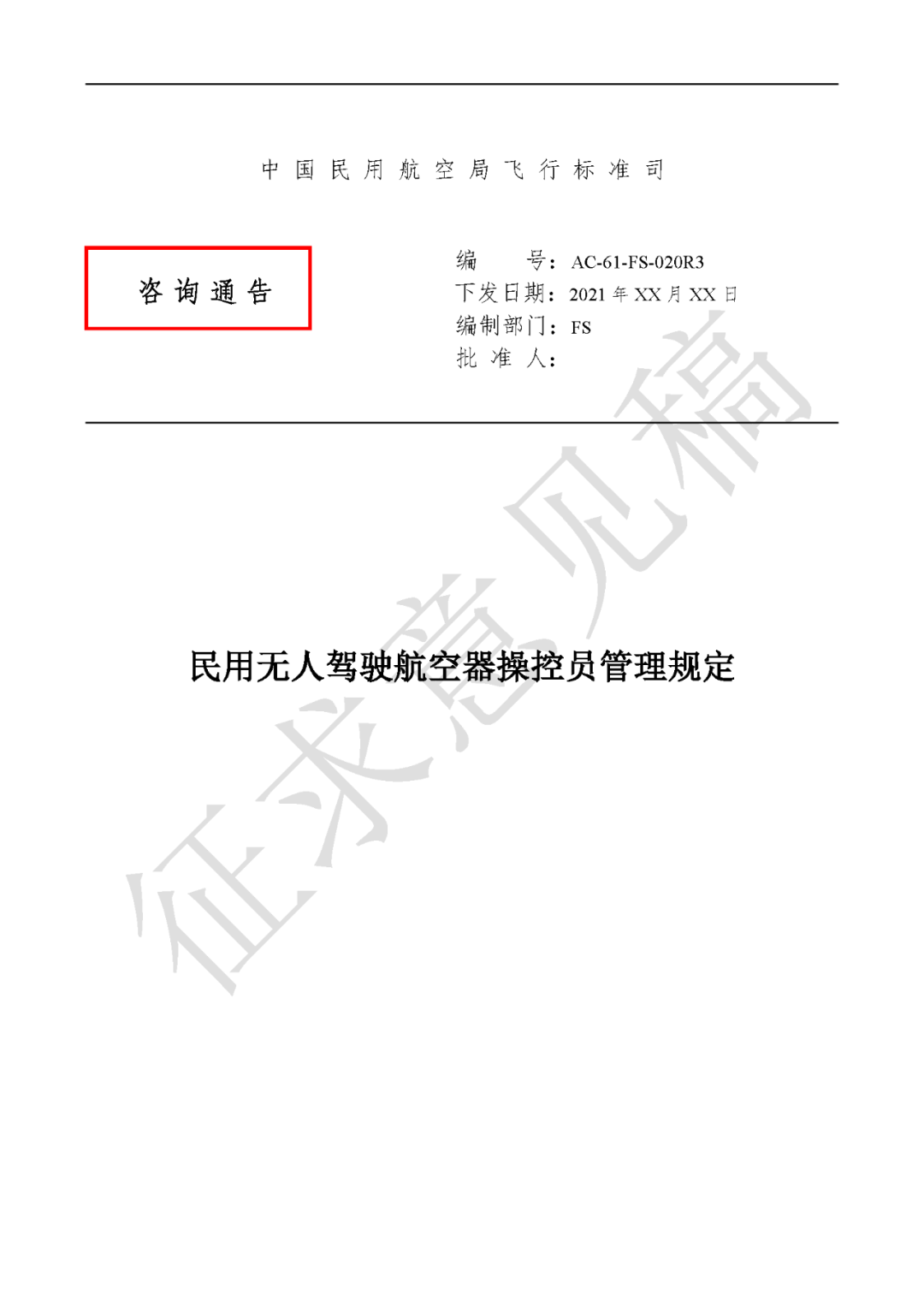 根据征求意见稿,无人机操控员管理按照CCAR-61部颁发的执照和等级
