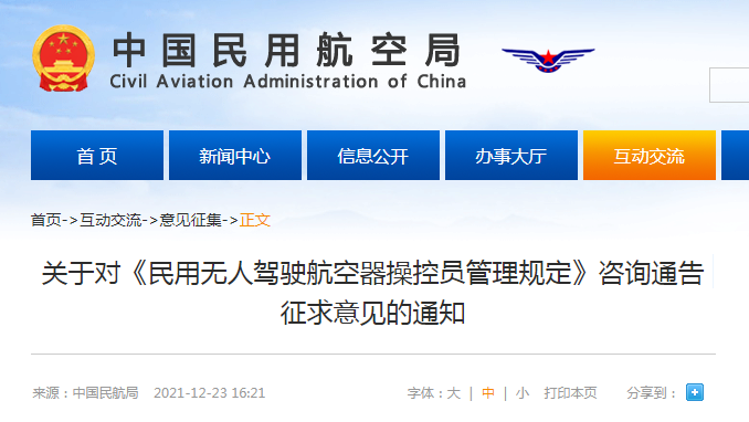 现面向行业和社会公开征求意见,任何单位和个人如有意见和建议,请于2022年1月10日前反馈至uaspilot@caac.gov.cn。