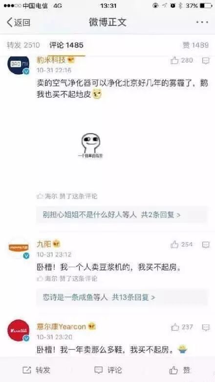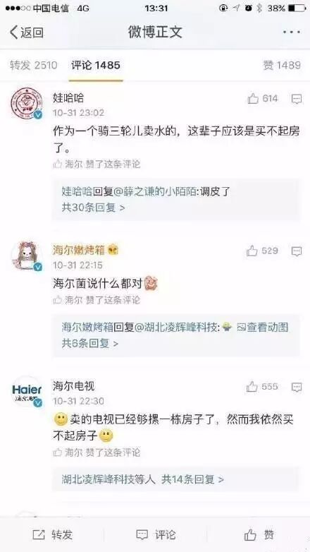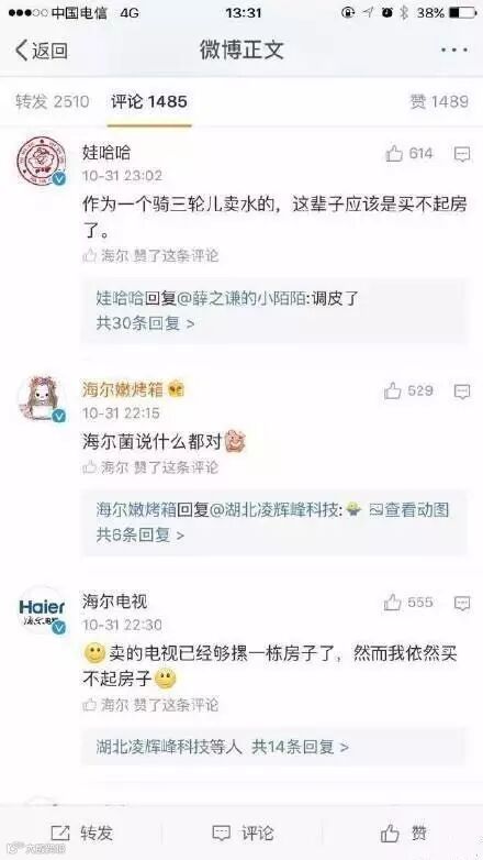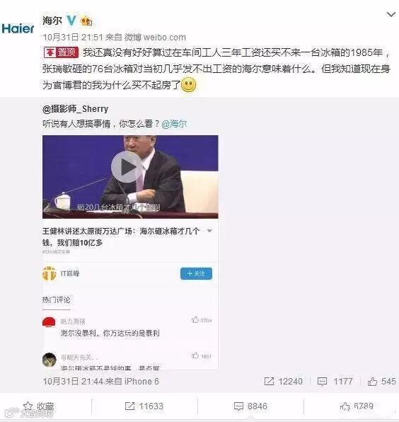 微博上头条了,海尔的霸气回应“还真没有好好算过在车间工人三年工资还买不来一台冰箱的1985年,张瑞敏砸的76台冰箱对当初几乎发不出工资的海尔意味着什么。但我知道现在身为官博君的我为什么买不起房了