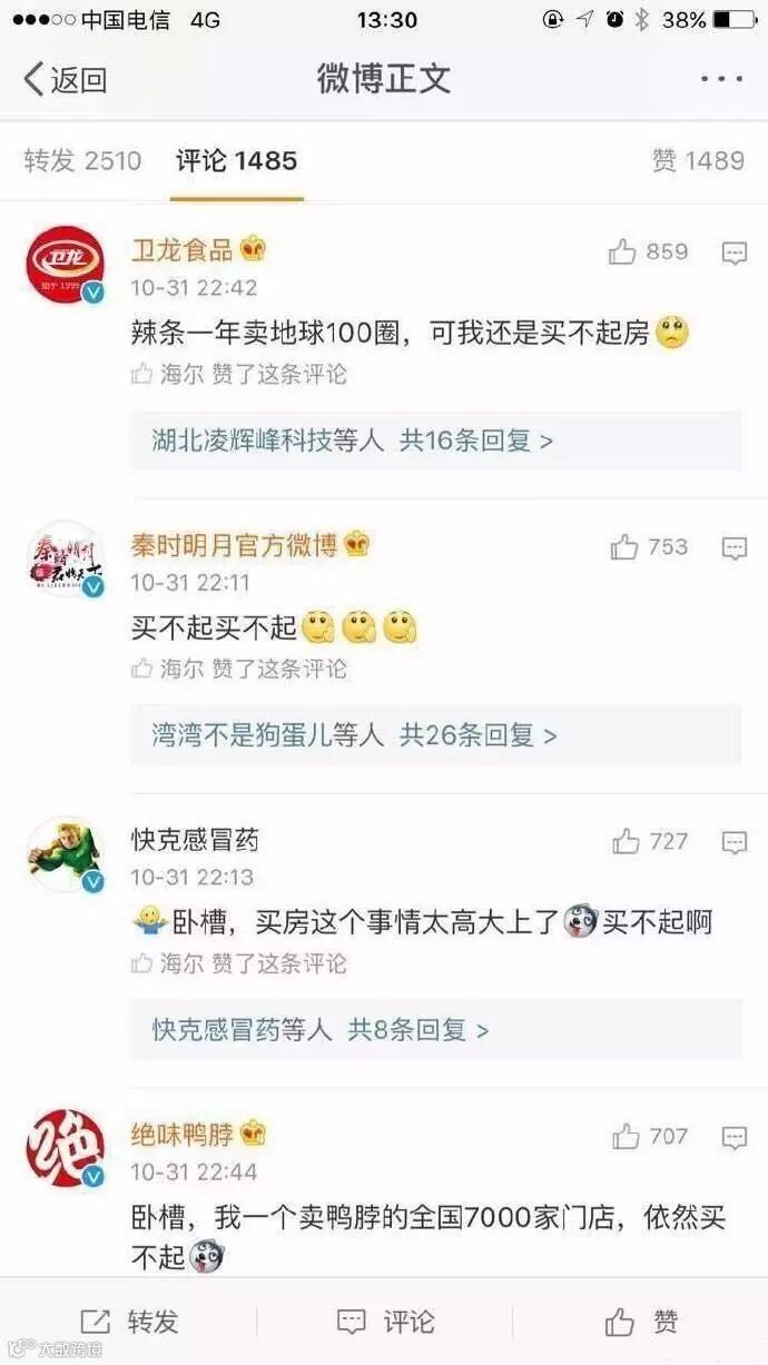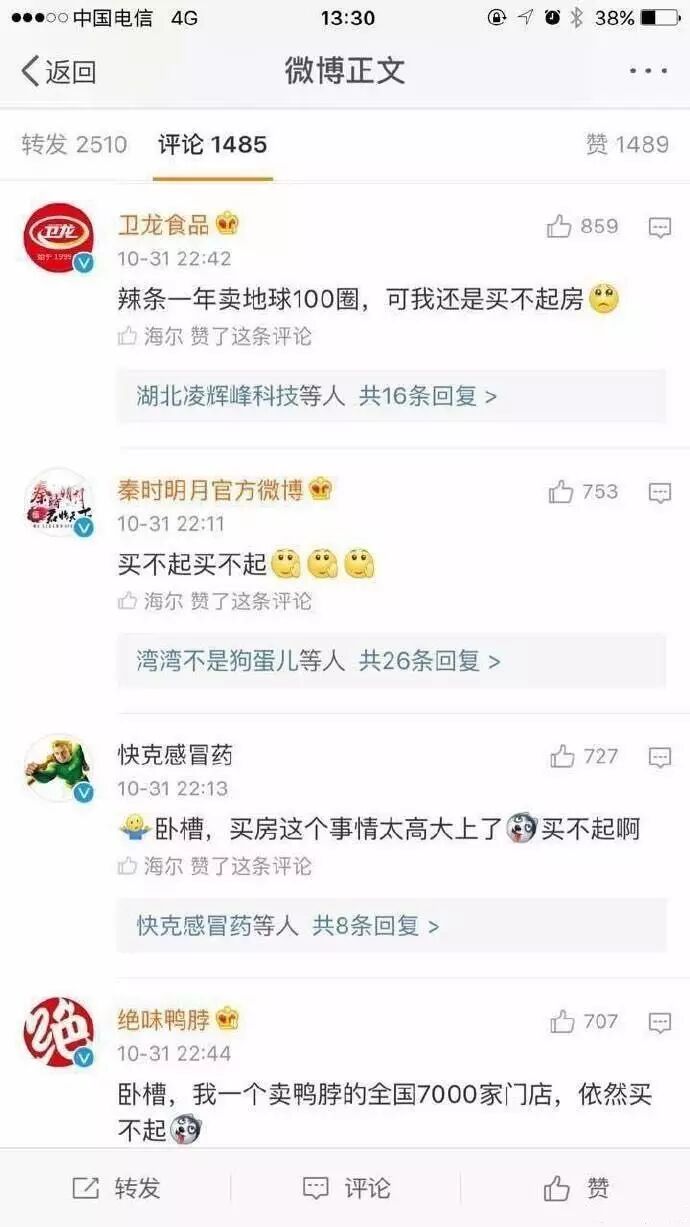 紧跟着,以辣条为首的各大品牌,也开始吐槽自己买不起房。