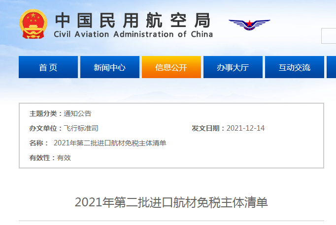 12月14日,民航局发布2021年第二批进口航材免税主体清单,航空工业通飞所属珠海中航飞行学校有限公司、石家庄中航赛斯纳飞机有限公司、珠海中航通用飞机客户服务有限公司、中航通飞华北飞机工业有限公司、石家庄飞机工业有限责任公司、中航通飞华南飞机工业有限公司、内蒙古通用航空股份有限公司、河北中航通用航空有限公司等多家单位在列。