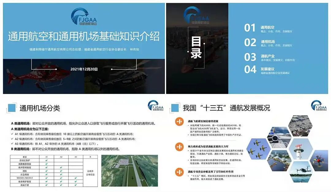 为宣贯通用航空政策,全面提升我省发改系统通用航空业务水平,更好的服务我省通用航空业发展,福建省发展和改革委员会(以下简称“省发改”)于2021年12月20日在福州举办全省通用航空发展培训班。福建省通用航空行业协会副会长(以下简称“省通航协会”)、福建和翔福宁通用航空有限公司(以下简称“和翔福宁通航”)总经理林传如受邀参加并发表了题为《通用航空和通用机场基础知识介绍》的主题发言。