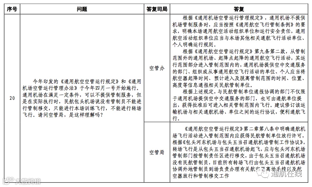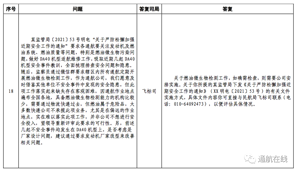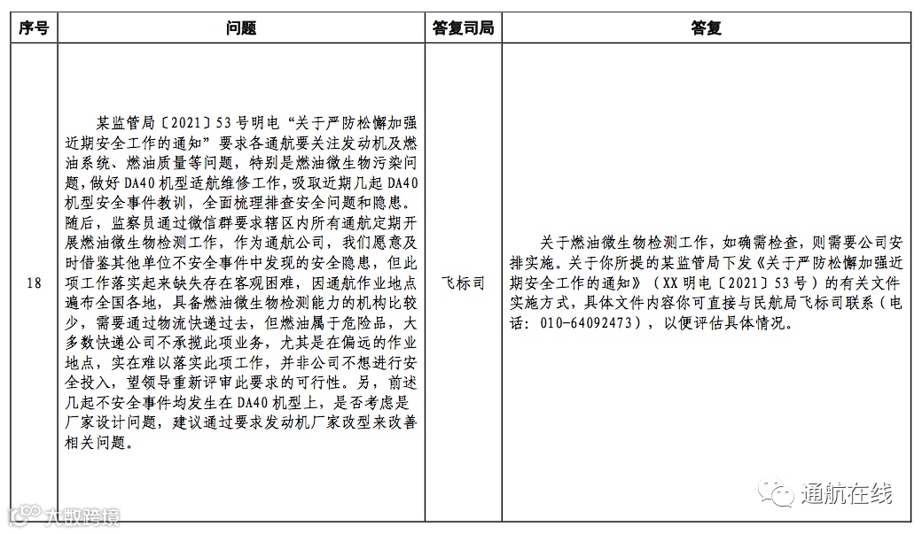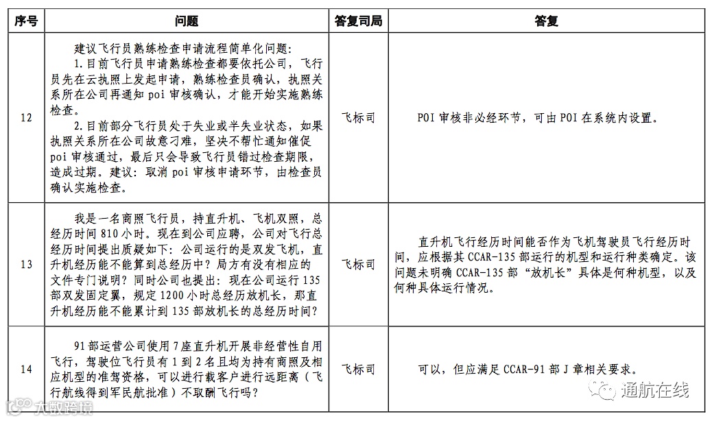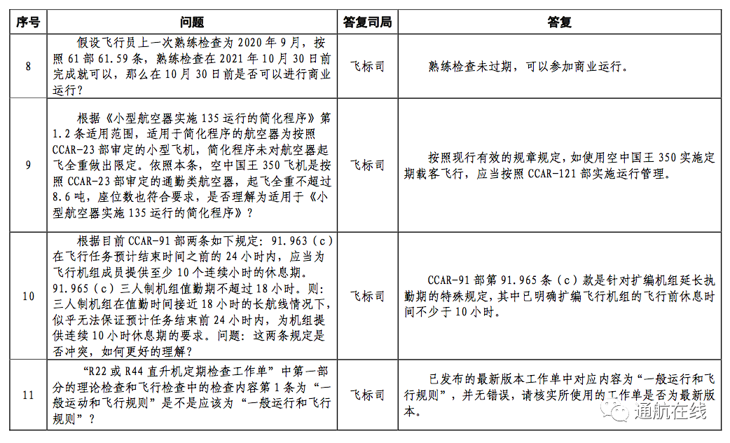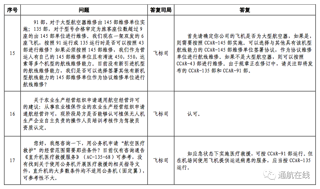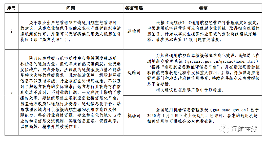 11月29日,民航局通用航空管理系统发布《关于通用航空管理“意见箱”的答复(第23期)》。为更好践行“人民航空为人民”初心使命,深入开展“我为群众办实事”,结合新时期通用航空发展需求,后续“意见箱”将持续聚焦在通用航空政策、法规、标准的制定、适用、执行和监管方面,回应企业关切,及时解答问题,广泛听取建议。8-10 月,通用航空“意见箱”共征集涉及通用航空政策、法规、标准的咨询和建议21 条。按照职责分工,我司组织民航局相关业务司局对上述咨询和建议认真研究,逐一明确答复口径。现将有关情况予以公布。详情如下(点击看大图):