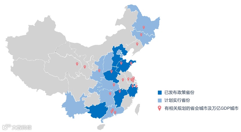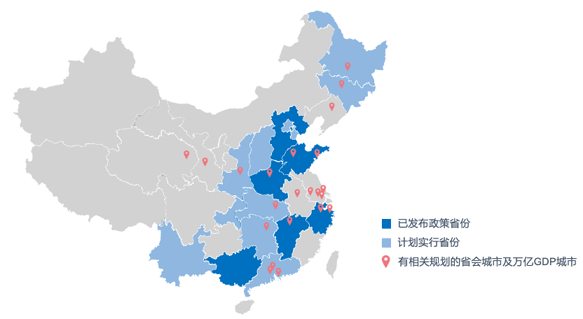 根据公开信息统计,全国31个省和直辖市中,有6个省份已发布链长制相关政策,9个省(市)提出链长制实施计划,省会城市及万亿GDP城市中有22个已有相关规划。从全国态势图可以看出,东部沿海地区和中部地区纷纷在全省范围积极推行链长制。