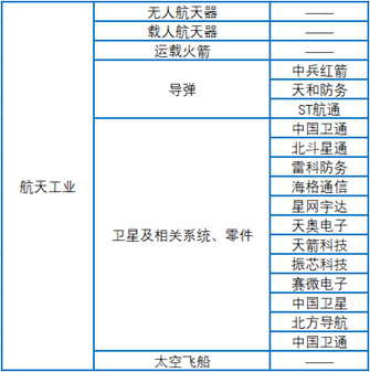 从事研制与生产航天器、航天运载器及其所载设备和地面保障设备的工业,是国防科技工业的重要组成部分,也是军民结合型的高技术产业之一,是综合国力的象征。涉及到电子、计算机、冶金、材料、机械、特种工艺、低温与真空技术、测试、控制、测控、气象、船舶、生物、农业等领域。主要产品:包括火箭、导弹、卫星发射、载人航天器等。