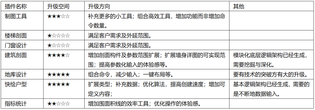 实际上升级空间大小除了其自身规律性强弱,导致的目前开发深度以外,还跟技术(比如AI手段)、输入量等有关。就拿输入量来说,指标统计目前仅是面积类及停车位数量统计,当然也是大部分内容了,其余统计自然需要从标的物获取,那么为了统计少量指标,需要建立一个标准(比如统一图块名称),然后强化到绘图习惯里,那么可能不如采用零散命令收集,直接输入来的直接。但从系统性上来说,改变绘图习惯的必要性也有,这是个权衡问题,也是执行力问题。但对于指标计算这个操作体验感方面,还是有很大的升级空间。