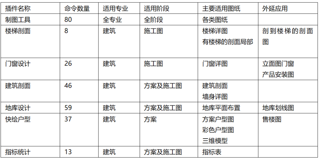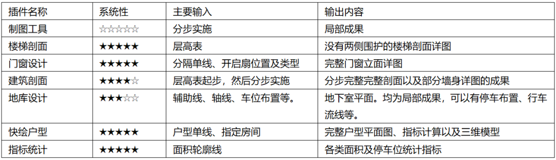 系统性上看,快绘户型、门窗设计、楼梯剖面、指标计算是最强的,严格的流程,命令与命令之间都是有衔接的,单独使用大部分是没用的。这类插件核心命令很少,操作步骤不多,软件帮我们做的事情很多。可以理解就是一键生成,指标计算除外。