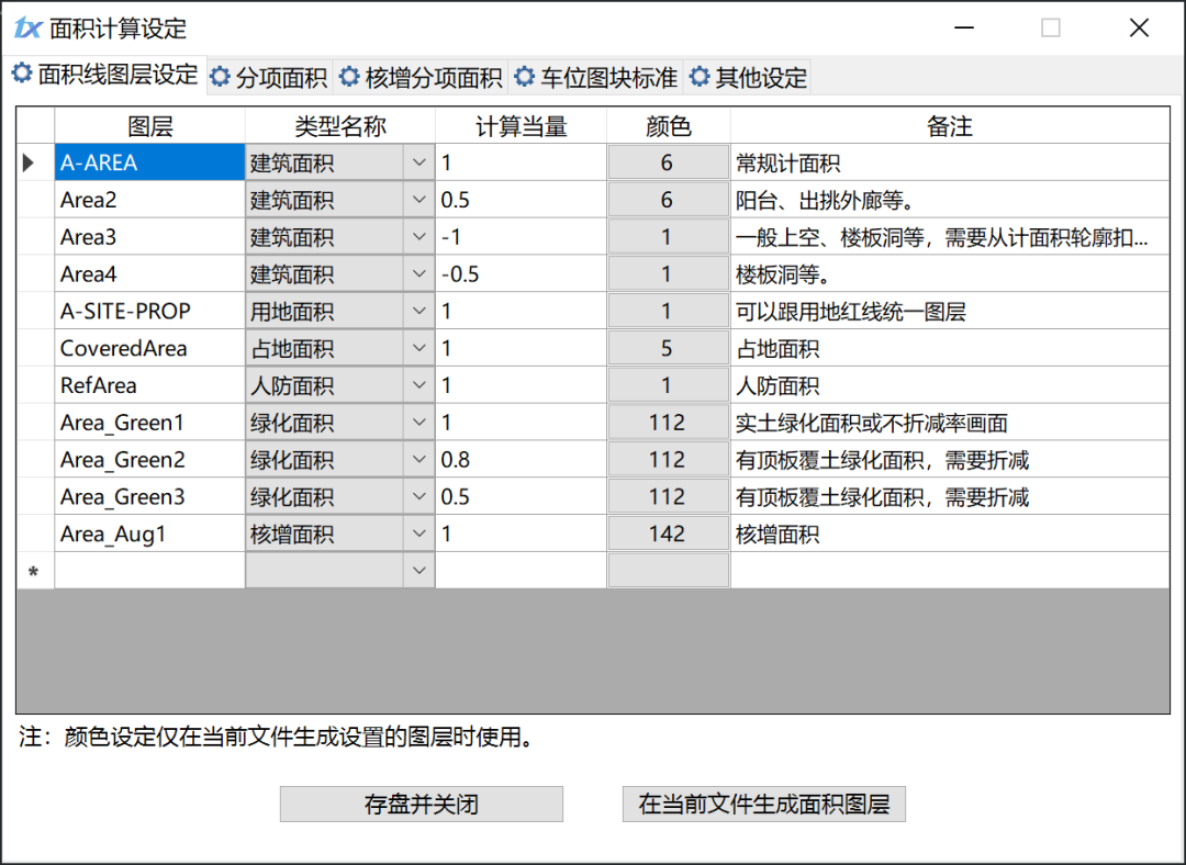 面积指标是基于特定图层的闭合pline线统计的,所以为了提升设计师的体验,我们在图层管理方面下了点功夫。根据面积类别拆分逻辑(见下图),从粗到细有四级划分:面积类别、地上与地下、面积当量、分项,这四级里面积类别和当量是通过特定图层划分的(详见下图设定界面)。