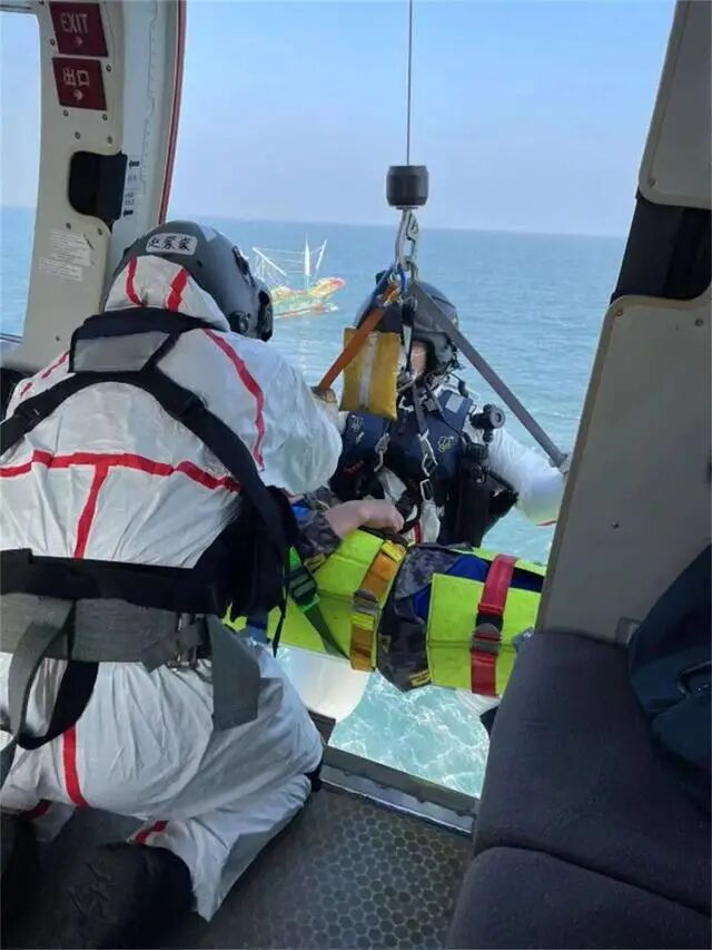 10时10分,在相关航管部门协调指挥下,东海第二救助飞行队“ B-7435”机组从高崎机场起飞,赴现场执行任务。10时46分,机组到达事发海域并发现落水人员。4名船员抱团趴在一个煤气罐和船只杂物上。机组经过观察,找准吊运点,放下救生员到海上进行营救作业。此时,事发海域风浪较大,一个浪打来,救生员就被推出去6、7米远。救生员拼尽全力游向遇险人员,经多次尝试,到达遇险人员身边。11时12分,在机组努力下,救生员成功将4名落水船员吊运进机舱。经过对落水人员检查,4人均出现低温症,其中2人还有外伤,血流不止。机组综合研判决定,将被救者直接送到厦门大学附属翔安医院进行救治。11时40分,机组成功落地 厦门大学附属翔安医院停机坪。截至当日下午17时,经医院紧急检查治疗,4名落水船员已脱离生命危险,核酸检测均为阴性。