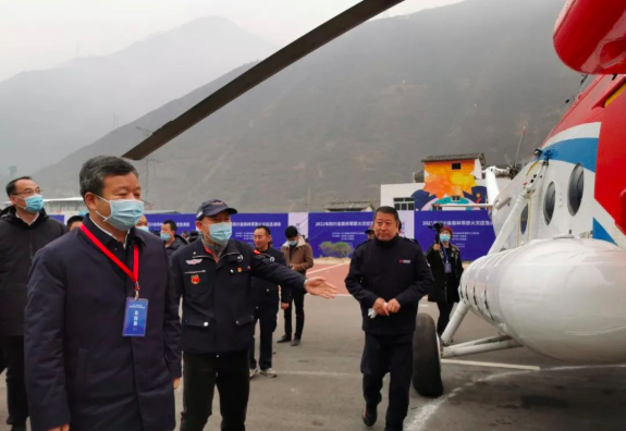 演练结束后,四川省曹立军副省长、阿坝州委书记刘坪、州长罗振华等领导到直升机前看望慰问机组人员,并登机查看了直升机、吊桶等灭火设备和航空救援装备。在机舱内,杨旭东向曹立军等领导介绍了高原型M-171直升机的性能、执行航空应急救援任务及今年春季在扑救四川省木里、冕宁、甘孜九龙等森林火灾中发挥的重要作用,省领导充分肯定了南航总站及成都站在森林航空消防取得的成绩和为生态文明建设作出的贡献。