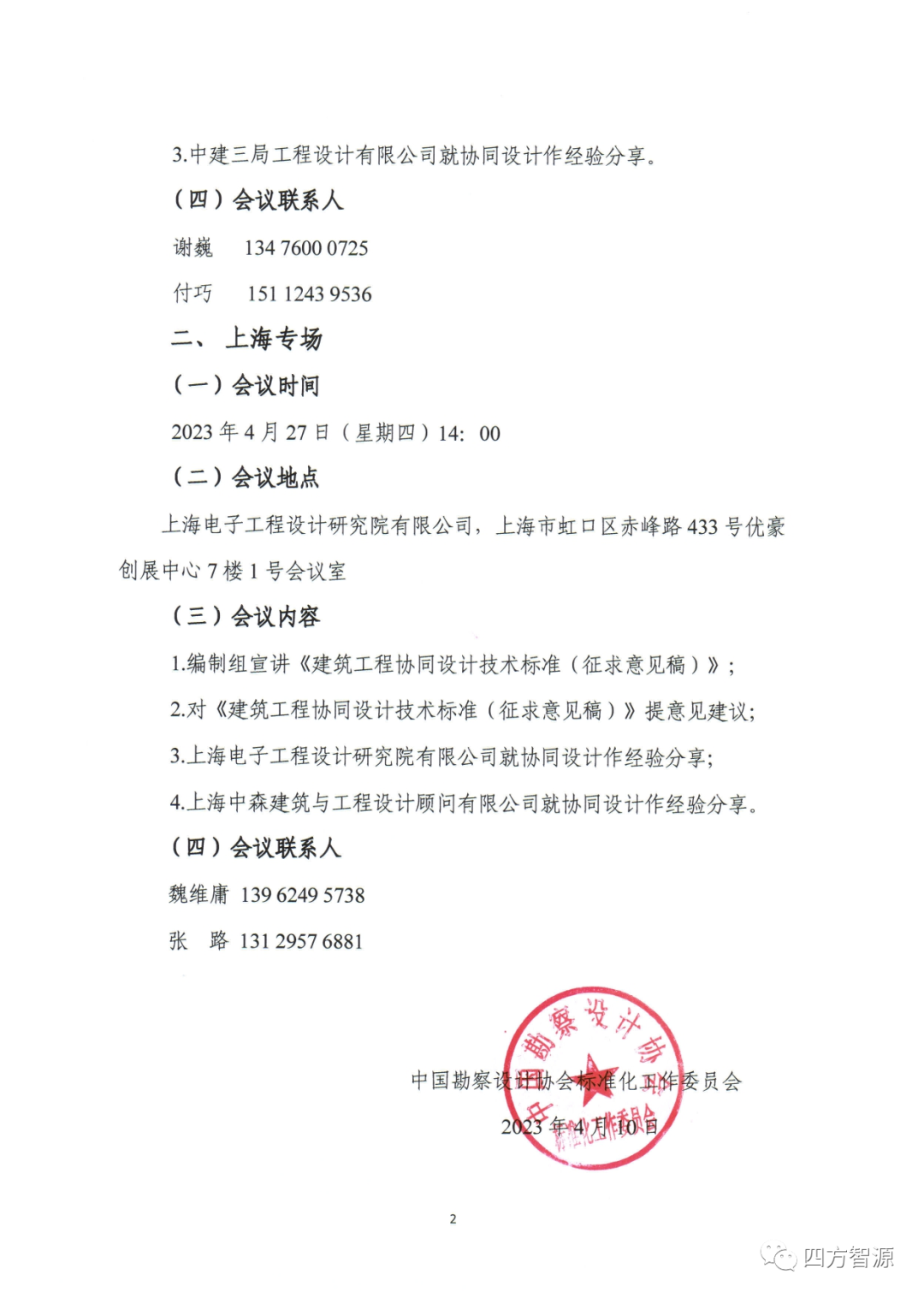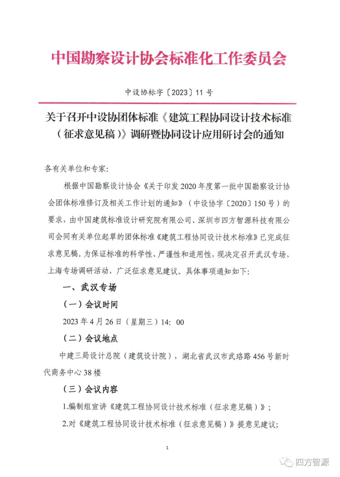 中国勘察设计协会标准化工作委员会发文,中国建筑标准设计研究院有限公司、深圳市四方智源科技有限公司主办、中建三局工程设计有限公司、上海电子工程设计研究院有限公司承办的建筑工程协同设计技术标准(征求意见稿)武汉、上海专场调研暨协同设计应用研讨会于4月26日、27日在武汉、上海成功召开。本次会议旨在广泛征求建筑工程协同设计技术标准(征求意见稿)的意见和建议,以保证标准的科学性、严谨性和适用性。