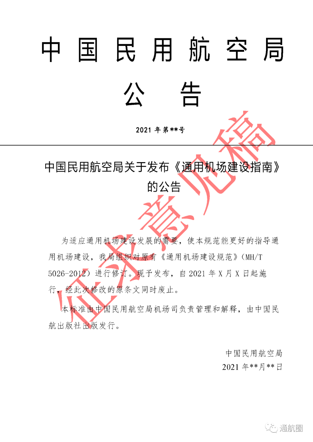 为指导通用机场的规划建设,日前,民航局机场司组织编制了《通用机场建设指南(征求意见稿)》,现广泛征求意见。