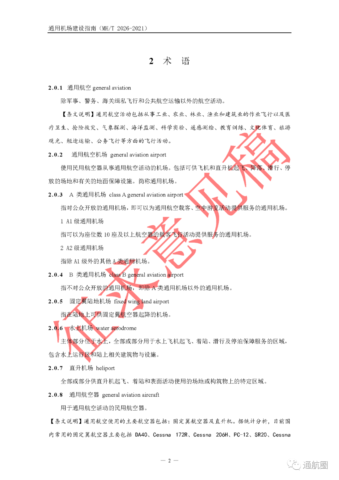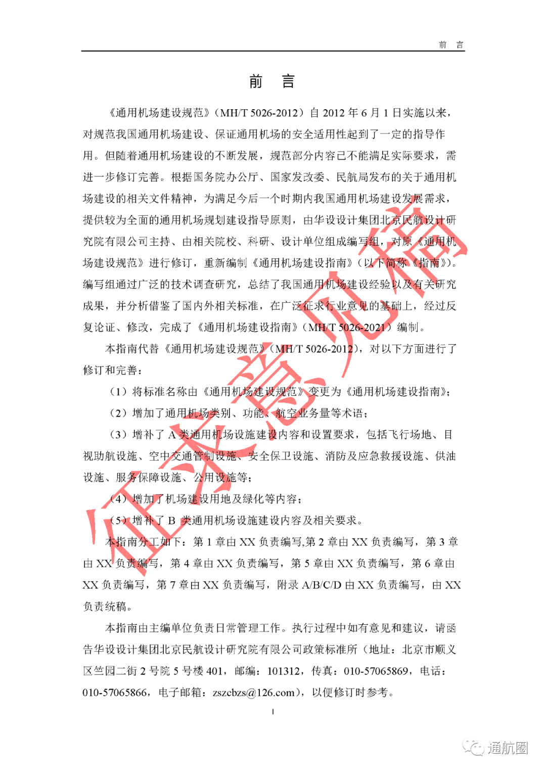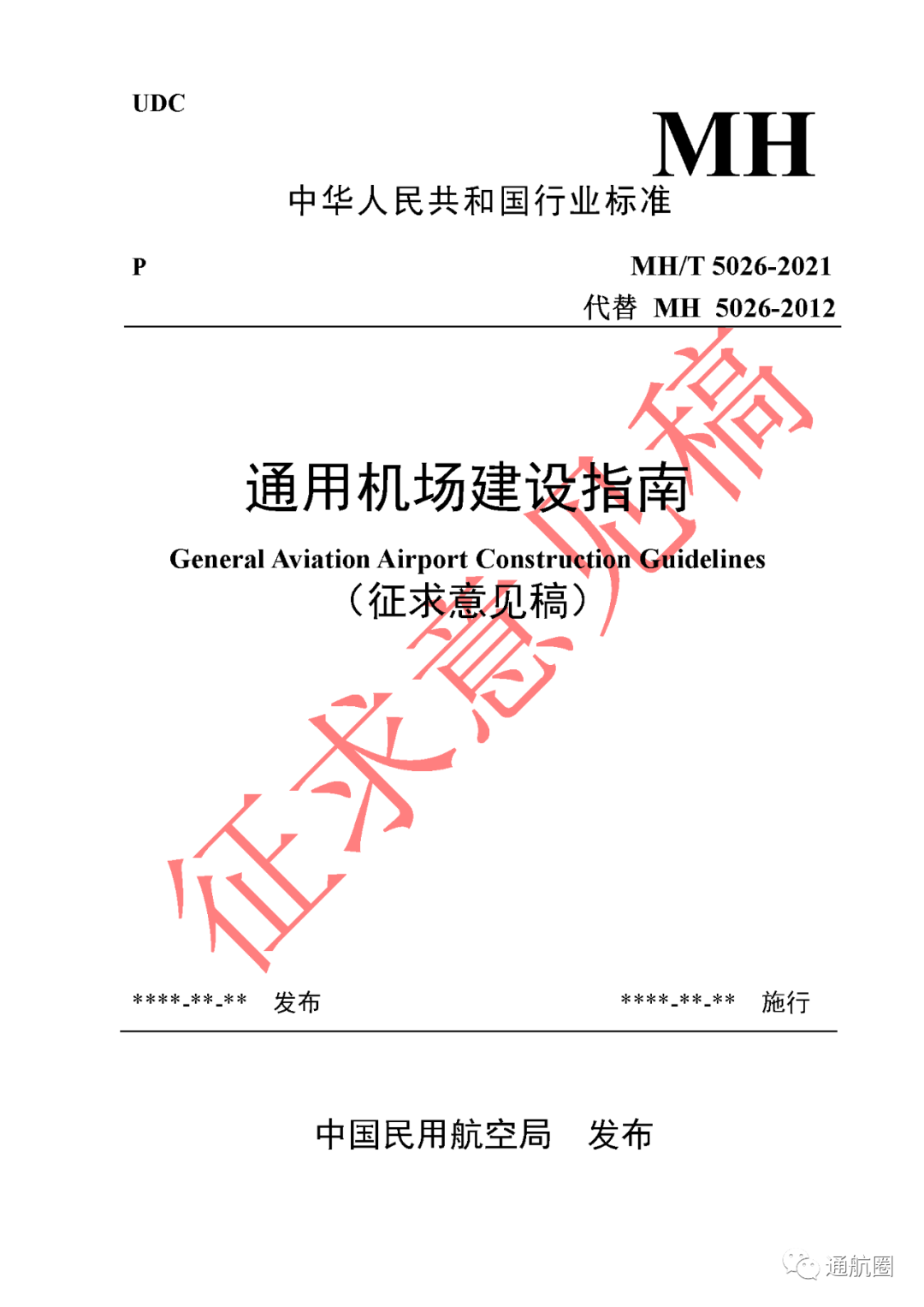 根据通知文件,《通用机场建设规范》(MH/T 5026-2012)自 2012 年 6 月 1 日实施以来, 对规范我国通用机场建设、保证通用机场的安全适用性起到了一定的指导作 用。但随着通用机场建设的不断发展,规范部分内容已不能满足实际要求,需进一步修订完善。根据国务院办公厅、国家发改委、民航局发布的关于通用机 场建设的相关文件精神,为满足今后一个时期内我国通用机场建设发展需求, 提供较为全面的通用机场规划建设指导原则,民航局组织对原《通用机场建设规范》进行修订,重新编制《通用机场建设指南》,形成了《通用机场建设指南》(MH/T 5026-2021)。该指南代替《通用机场建设规范》(MH/T 5026-2012),重点对以下方面进行了 修订和完善: