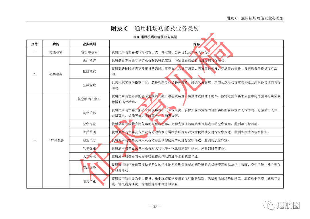 此外,指南还在附件中对“通用机场常用固定翼机型参数”、“ 通用机场常用直升机机型参数” 、“通用机场功能及业务类别” 、“常用固定翼及直升机机型常规单架飞机机库规格”进行了明确。其中,通用机场功能及业务类别中,又将通用机场的功能分为交通运输、公共服务、工农林服务、航空消费、飞行培训5类,这5类功能下面又分为客货邮运输、医疗救护、抢险救灾、公共管理、航空喷洒、航空护林、空中巡查、海洋监测、渔业飞行、气象探测、人工降水、石油服务、电力作业、航空物探、航空摄影、直升机引航、直升机机外载荷飞行、航空器制造及试飞维修、空中游览、空中拍照、空中广告、航空表演、个人娱乐飞行、跳伞飞行服务、航空器代管、科学实验、飞行培训、航空训练飞行等28个业务类别。