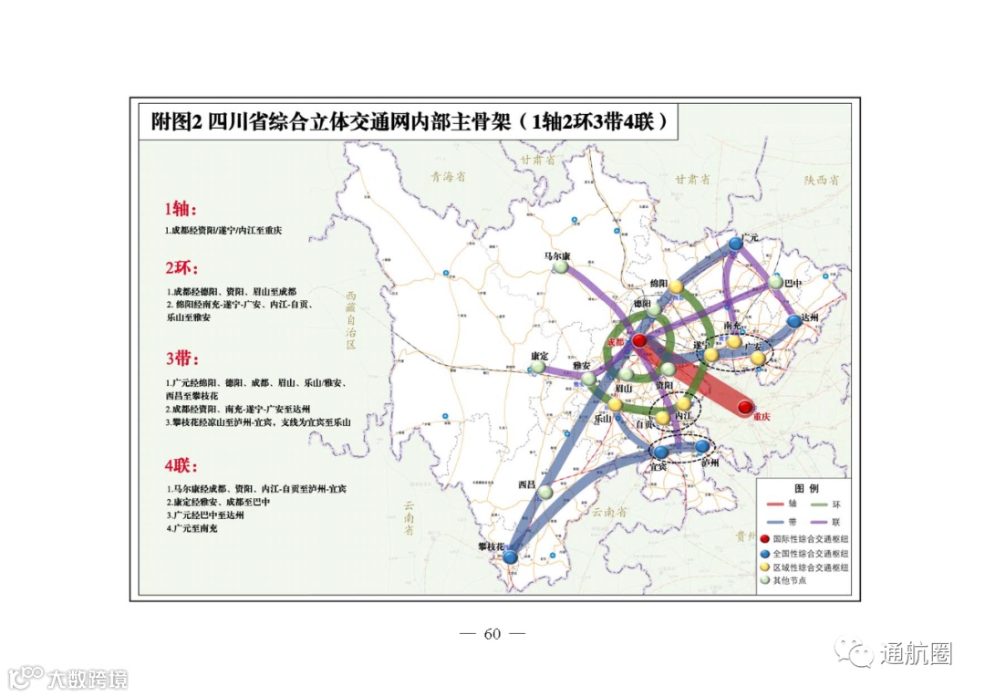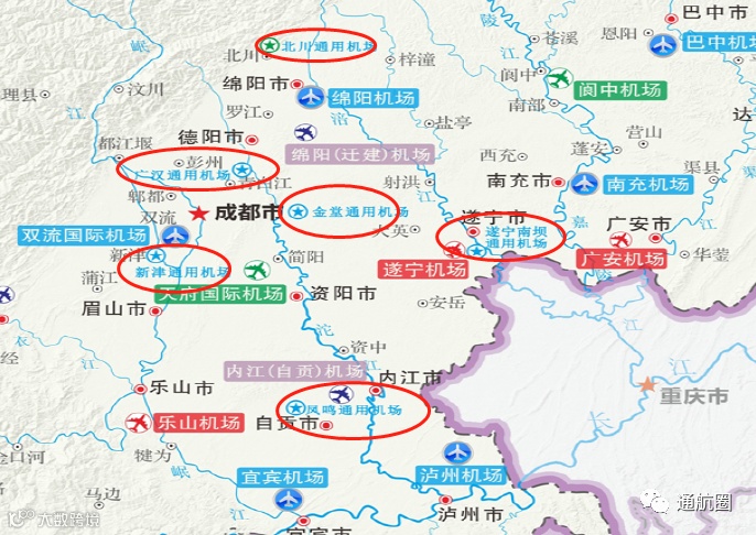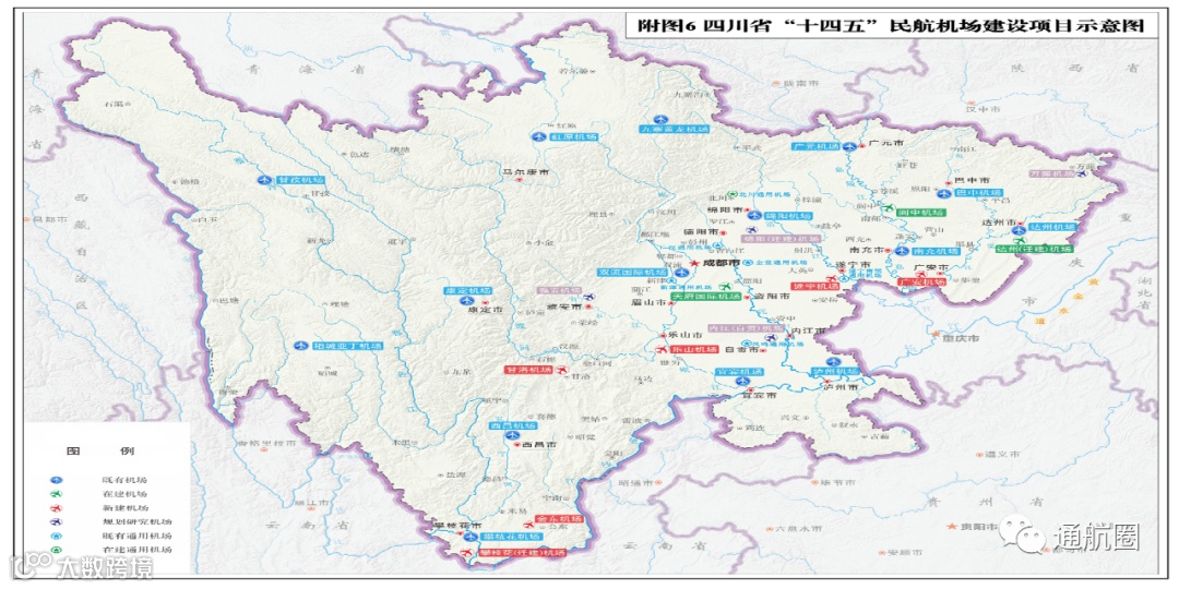 在民用运输机场方面,规划提出,加快完善“干支结合、客货并举”的民用运输机场布局体系。提升成都国际航空枢纽能级,建成投运成都天府国际机场(投资超750亿!彭清华宣布成都天府国际机场正式投运!),提升双流国际机场保障能力,实施“两场一体” 运营模式,加快成都航空货运枢纽建设,完善航空货运专用设施。加密支线机场布局,促进机场间功能互补、差异化发 展、一体化协作。建设平安、绿色、智慧、人文“四型机场”。“十四五”时期,将续建成都天府国际机场、阆中机场、达州机场(迁建),改扩建 九寨、绵阳机场。新开工乐山机场(乐山市5个通用航空临时起降点获得西部战区空军批复,乐山机场最快也将于今年9月开工),改扩建南充、广元、西昌等机场。开展广安机场、遂宁机场、会东机场、甘洛机场、雅安机场 等,改扩建宜宾、泸州、红原等机场的前期工作,研究论证内江(自贡)机场建设及相关机场迁建工作(注:四川省政府已原则同意《内江自贡同城化发展总体方案》)。