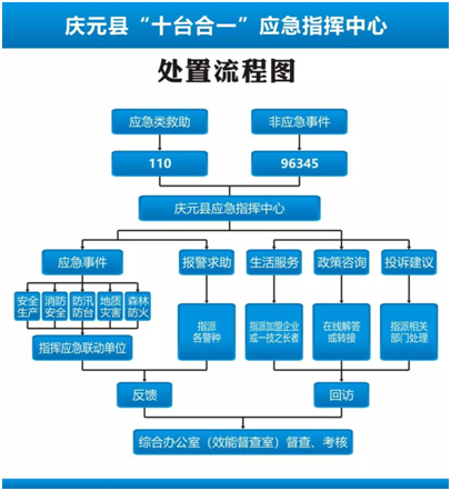 丽水市庆元县“十台合一”智治中心平台整合了政府应急联动指挥中心、公安110指挥中心、住建“数字城管”指挥中心、民政96345公共服务中心、情报信息研判中心、平安建设信息系统、山洪和地质灾害监测、安全生产综合监管系统、防汛防旱和森林防火应急指挥、县乡村(三级)无线应急广播等十个平台,形成“十台合一、一个中心、三大系统”组织架构,成为集应急指挥、治安防控、公共服务、城市管理、灾害预警、信息研判于一体的指挥调度和服务民生的综合化管理指挥平台。通过事件受理、分析研判、精准分流、指挥调度、部门办理、办理反馈,实现各类事件信息采集、传输、判定、指挥、调度、办理、实时沟通、联动指挥、现场支持等功能的应急指挥系统。
