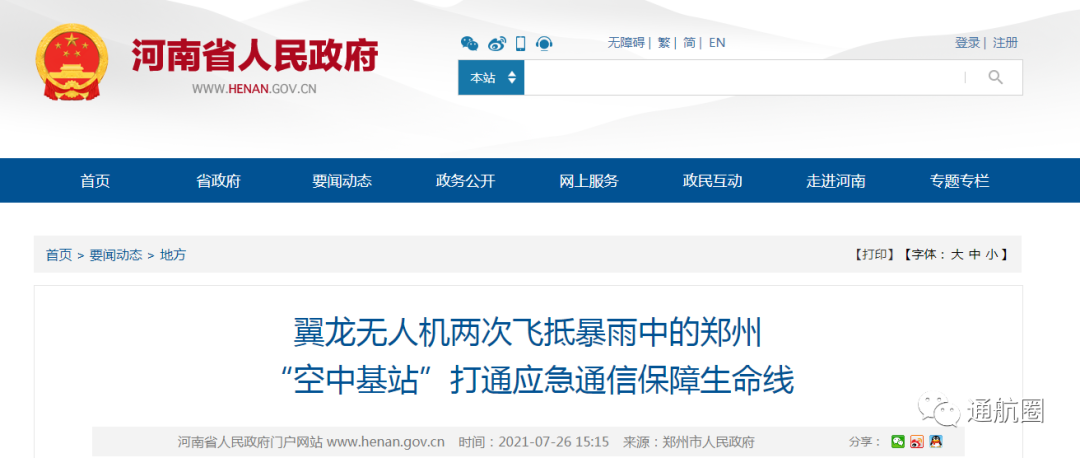 7月26日下午,河南省人民政府官网发文《翼龙无人机两次飞抵暴雨中的郑州 “空中基站”打通应急通信保障生命线》,这也是河南省政府官网在本次抗险救灾中首次以专题文章形式提及的无人机型号。该文具体内容如下: