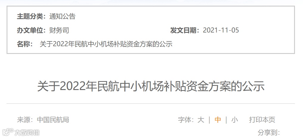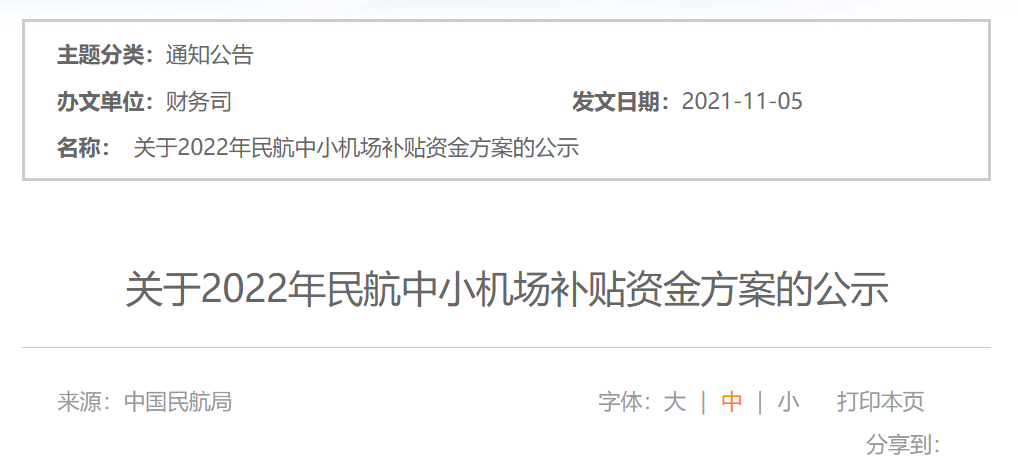 11月5日,民航局财务司发布《关于2022年民航中小机场补贴资金方案的公示》。