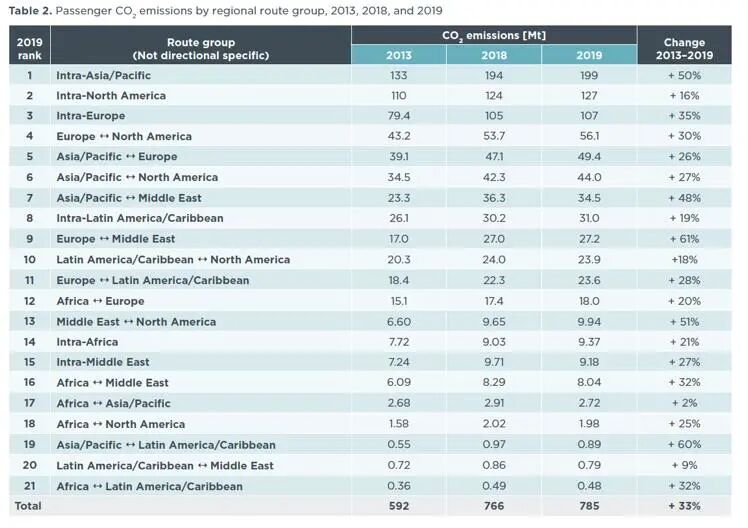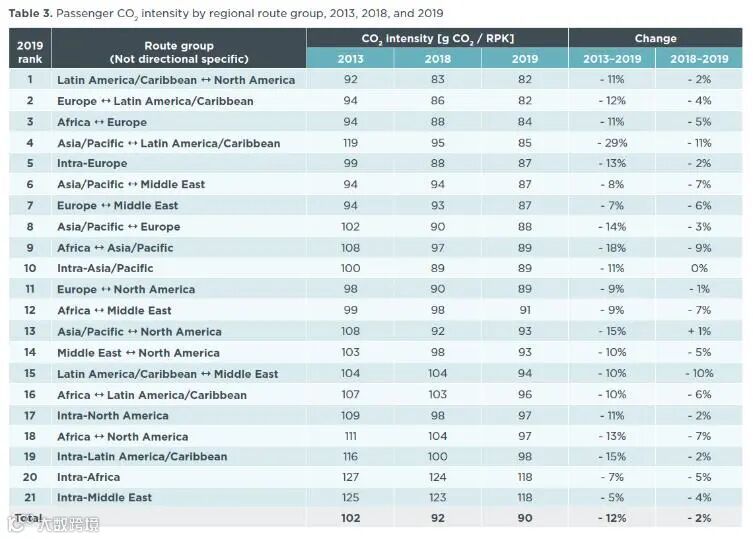这其中,比较2013-2019年的碳排放总体增量,亚太地区内部以及亚太-中东通道是两个碳排放增长最为迅猛的通道。这也和全球航空市场总运输量过去几年的增量来源比较匹配。