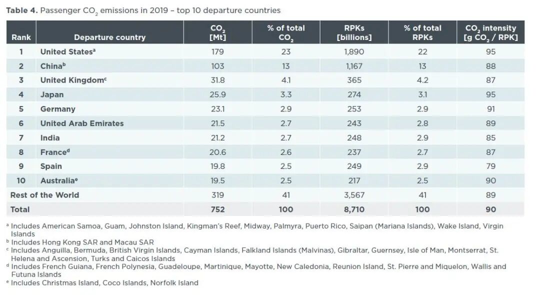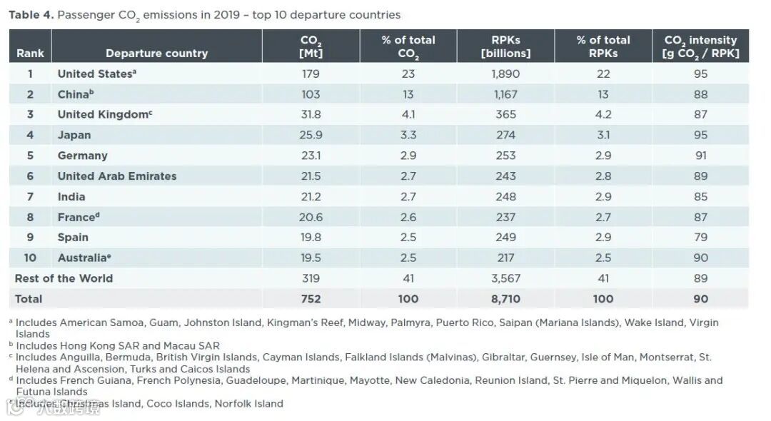 其中美国、中国和英国的航空二氧化碳排放量占据全球前三位,2019年的总排放量分别为1.79亿吨、1.03亿吨和0.32亿吨,3个国家合计占据当年全球总航空碳排放量的39.2%。而同时全球航空客运碳排放量前10的国家中有4个国家地处亚太地区,分别是中国、日本、印度和澳大利亚。