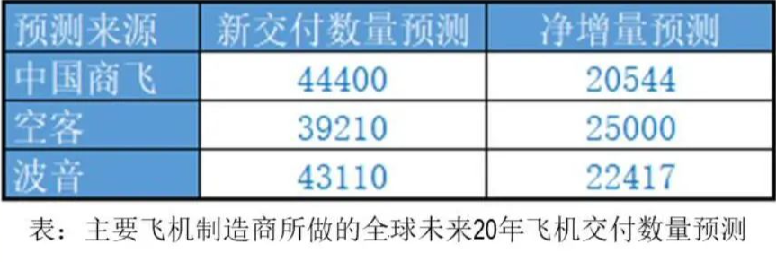 根据相关IATA预测,全球航空业运输需求预计至少要在2023年才有望恢复至2019年的水平,之后航空运输总量和新增飞机数量仍会持续增加,航空业减碳工作压力依然巨大。根据波音、空客和中国商飞的预测,未来20年全球飞机将交付40000架左右,其中机队更新和净增量各占总增量的大约一半。中国未来净增飞机预测数量为全球最高,到2039年可以达到全球飞机机队规模的21.7%,年增长率为4.68%。