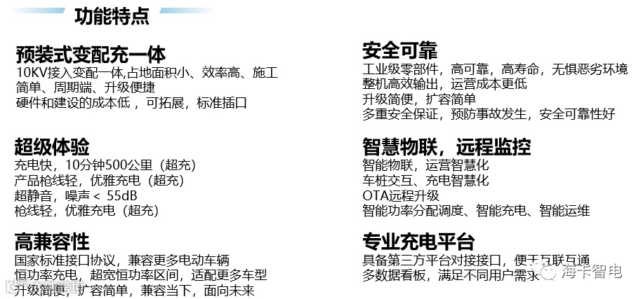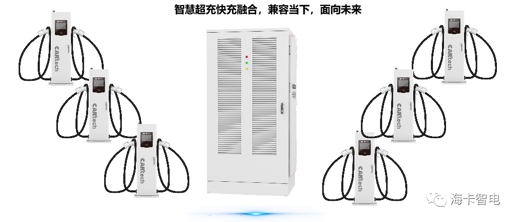 ——10KV超宽幅、预装式、智慧超级充电站颠覆传统 “变电站+充电桩+停车场”的建站模式,,兼容当前市场车辆充电需求,面向未来车辆技术升级趋势推出新一代直流群充系统,产品使用永不过时,产品采用预装式占地面积小,主站占地面积小于于4.5平方米,5个双枪充电终端占地面积为0.45平方米,施工时推荐使用上出线方案,无需充电终端布线施工,施工建设较”变电站+充电桩“方案更加简单和快捷