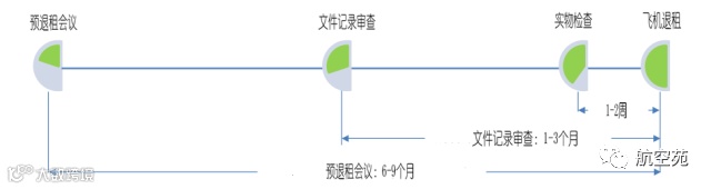 会议中出租方和租赁方会共同制定详细计划列出议程和时间表。同样重要的是,为避免时间和预算上的失误需要事先评估好各种意外的发生,建立相应应急机制。如有必要,会议还应详细分析飞机预期进口国适航法规的符合性要求。预退租阶段占整个飞机退租大部分时间,下图表明整个过程中各阶段时间关系。