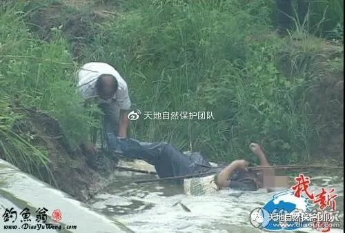盗猎者使用电捕鱼器正在江河进行毁灭性捕捞