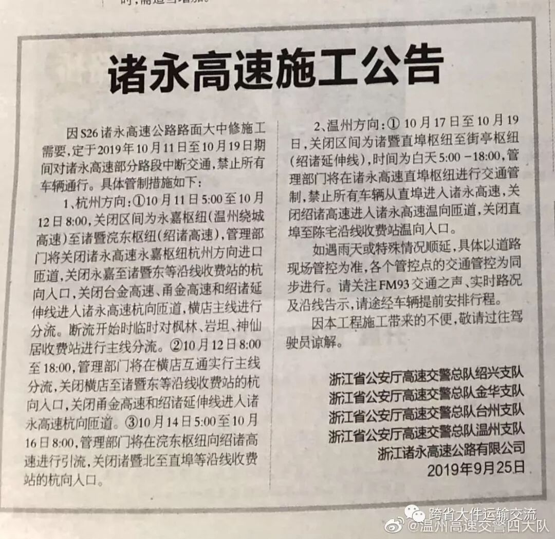 因S26诸永高速路面大中修施工需要,现在从2019年10月11日至10月19日期间对诸永高速部分路段中断交通,禁行所有车辆,通行车辆绕行方案如下图