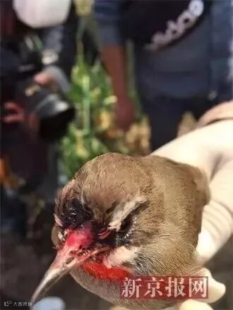 2016年华北多个护鸟团队在唐山某窝点举报,这只鸟市常见的红喉歌鸲,因撞笼严重受伤。