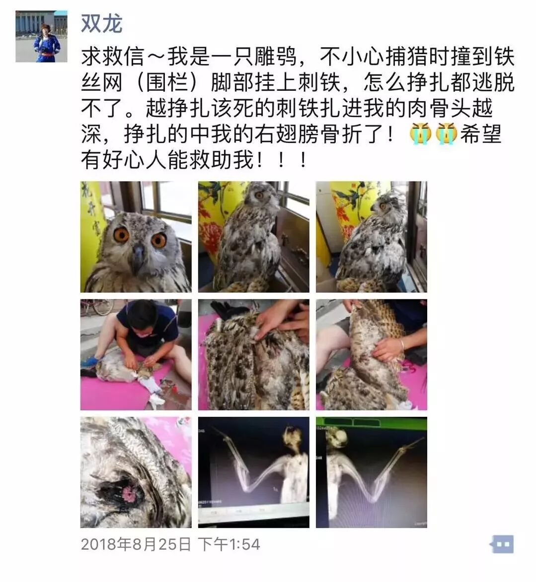 2018年8月31日,双龙一边精心喂养,一边通过让候鸟飞公益基金为雕鸮筹集治疗的资金,并通过微信群等方式寻找医生。经一名台湾野生保护志愿者联系,8月31日,双龙联系了毕业于中国农业大学动物医学院、中国执业兽医师张拥军医生。