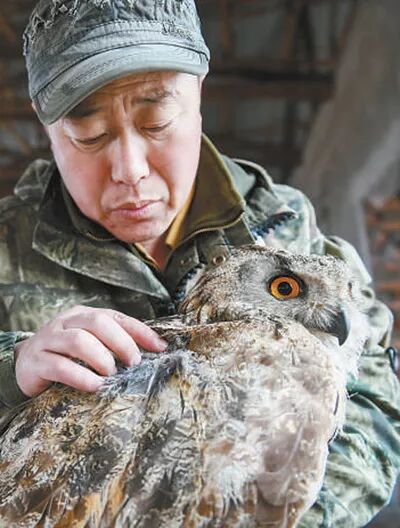 在照顾雕鸮时,双龙像对待孩子一样对待它,喂水,喂肉时,总会用蒙语呢喃安抚。渐渐地,雕鸮对双龙也有了依恋。“十一”长假时,双龙回乡探亲,让妻子和儿子照顾雕鸮。然而,“任性”的雕鸮不吃不喝,急坏了双龙的妻子,只好让双龙与雕鸮微信视频“劝食”。“你看,它的大眼睛,多漂亮,萌萌哒。”双龙看向雕鸮的眼神里充满了宠溺。