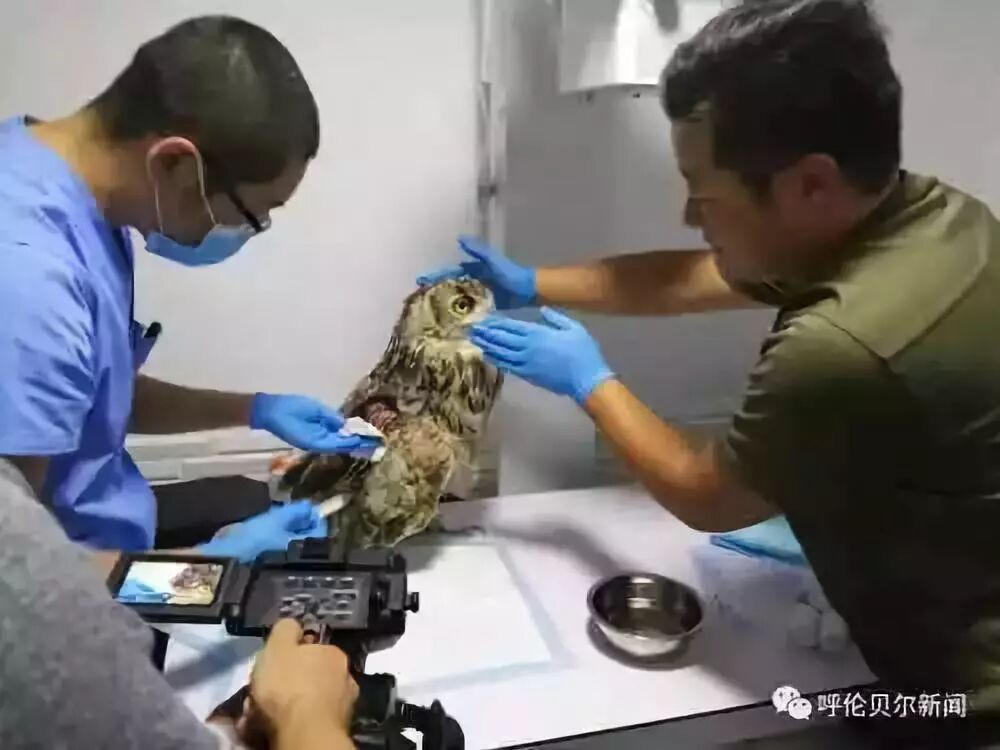 2018年9月3日 9月的草原日渐苍凉。清晨,双龙带着雕鸮行程300多公里来到海拉尔。一场秋雨让海拉尔这座城市清新怡人。玩皮宠物医院手术室内,来自北京的张拥军医生为雕鸮做了手术,海区几家宠物医院的医师均前来做助理、观摩学习。“手术难度比较大,术后休养也很重要,我会尽全力完成的。”张拥军医生结合20多年的临床经验,为在场的技术人员讲解手术要领。手术期间,记者进入手术室,看到双龙一边给张医生做助手,一边用蒙语安抚雕鸮。