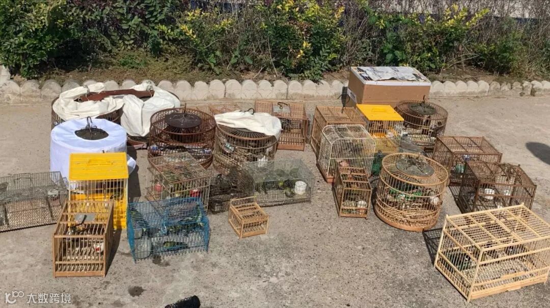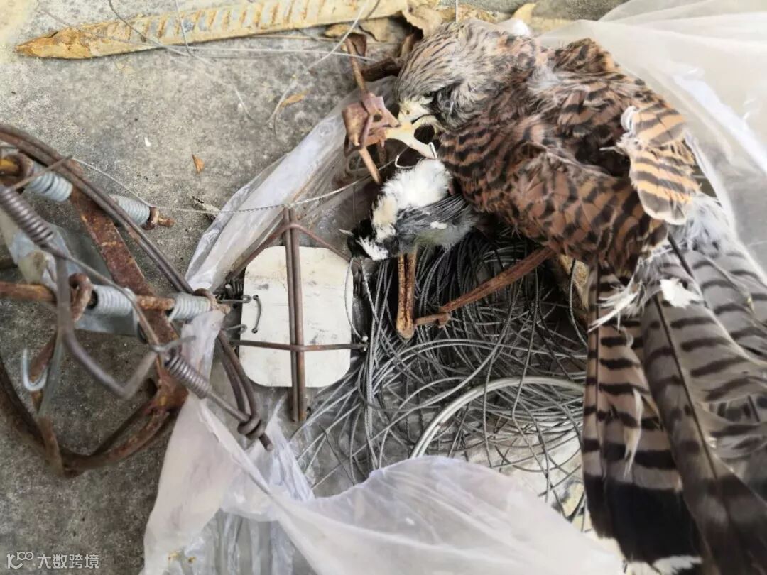 *现场逮捕一名盗猎者,从其盗猎点内发现数十个盗猎工具,包括有捕鸟网、打笼、狩猎夹子、拍网、诱鸟器等。其中包括一个猎夹上的一只诱饵及被捕获的国家二级重点保护动物红隼。当天现场发现和解救包括绣眼鸟、麻雀、小鹀、黑头蜡嘴雀、黑尾蜡嘴雀、黄雀、黄腹山雀、煤山雀、朱雀、黄眉鹀、大山雀等10余种近70只野生鸟。盗猎者被采取刑事强制措施。
