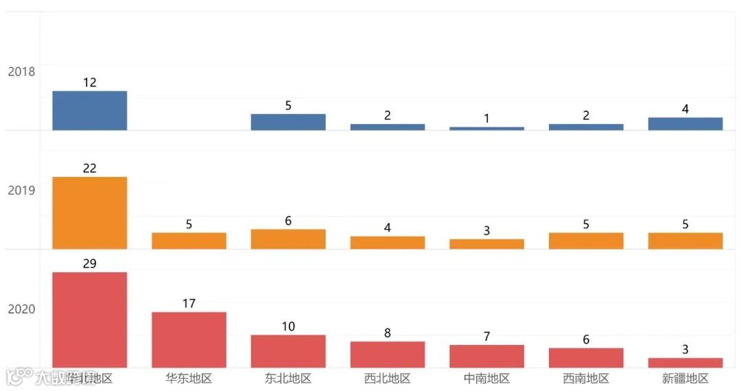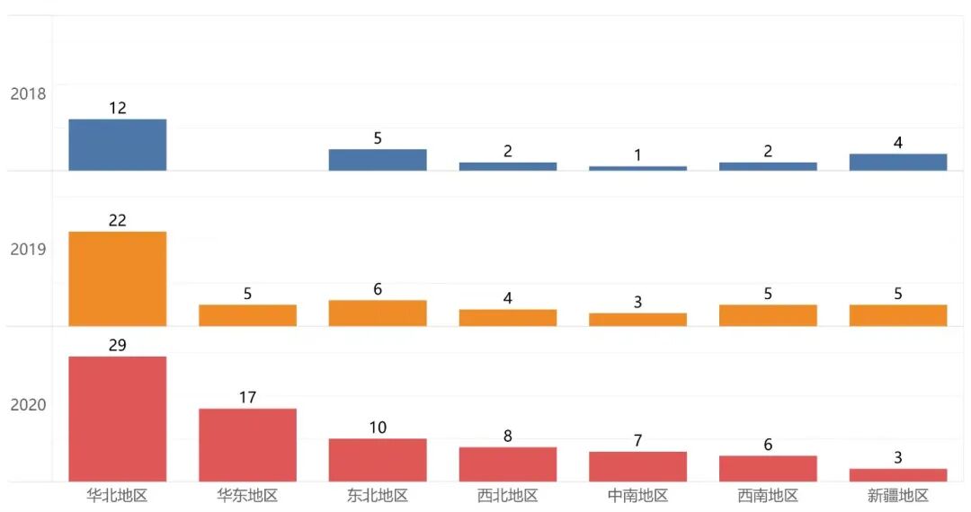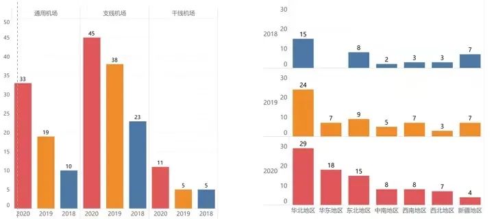 2020年,依旧是华北地区开通短途运输的支线机场数量最多,除新疆地区外,其余地区开通短途运输航线的的支线机场数量同比增加或持平;所有地区开通短途运输的通用机场数量同比增加或持平,华北地区排名第一;所有地区开通短途运输的干线机场数量同比增加或持平,华东地区的数量最多。