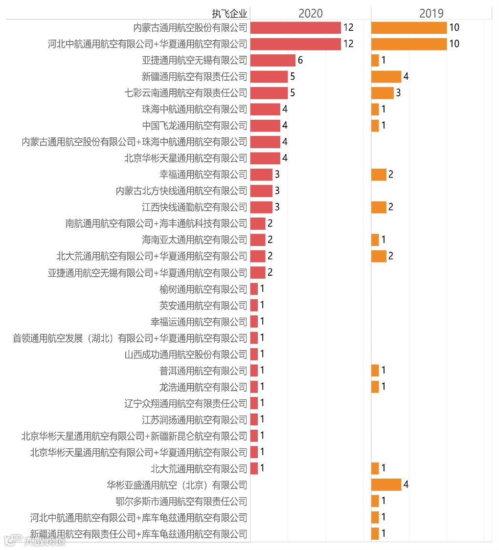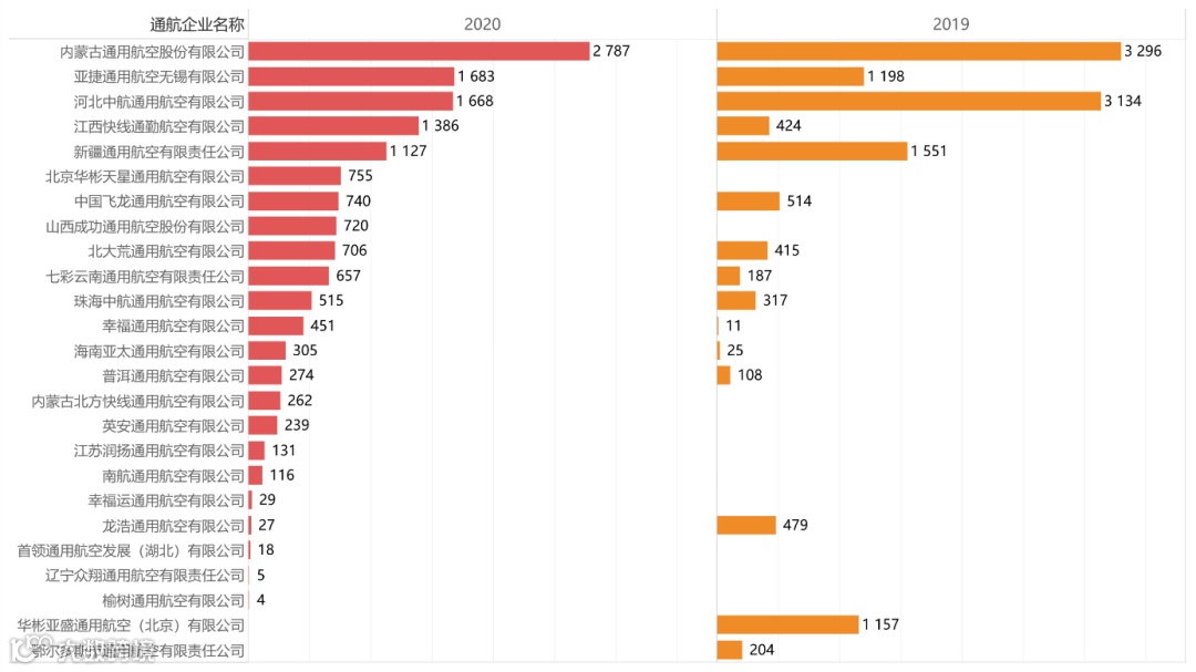2019年飞行小时数排名前三的内蒙古通航、河北中通航和新疆通航的小时数在2020年均有所下降,但内蒙古通航的飞行小时数依旧遥遥领先其他企业。其余通用航空企业中大部分的飞行小时数均明显增长,江西快线的飞行小时数净增长近1 000小时;成功通航首次开通短途运输航线,飞行小时数便突破700小时。