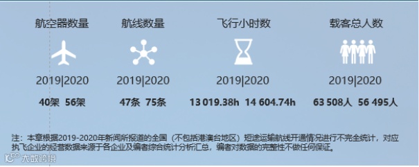 2020年短途运输发展的总体情况是,当年投入到短途运输的航空器数量较2019年增长了16架,航线数量增长28条,受新冠肺炎疫情影响,虽然飞行小时数增加了1600小时,但是在客人数减少7000人次。