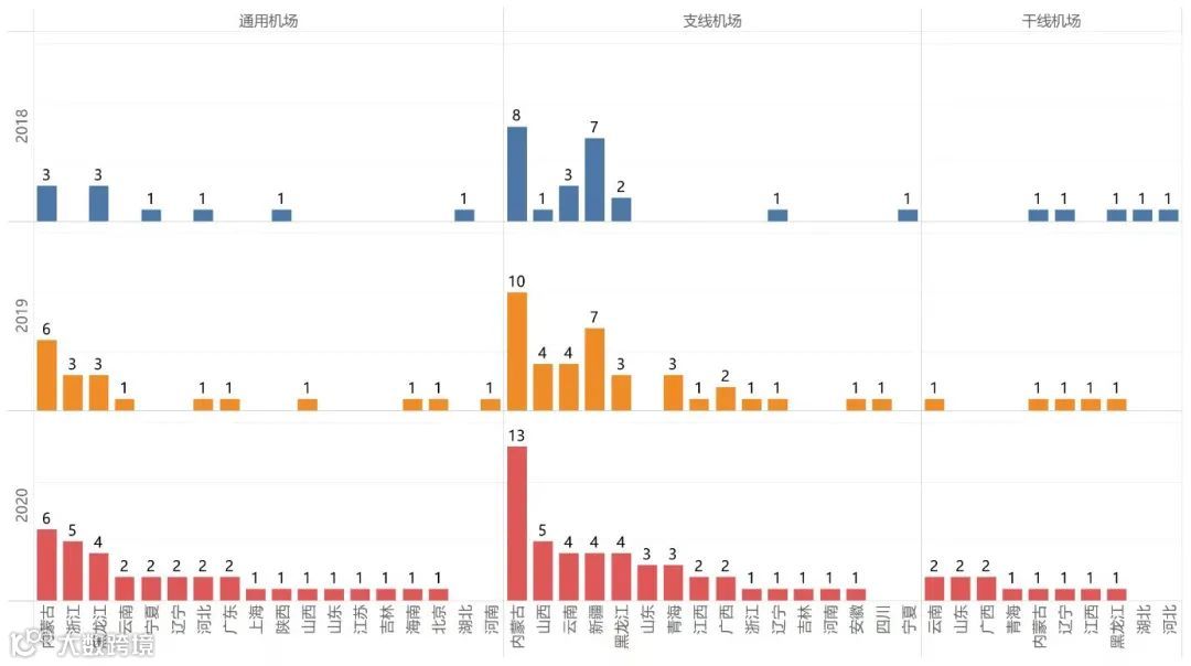 2020年,开通短途运输航线的三种类型机场所覆盖省份数量同比均有所增长,覆盖省份最多的是通用机场,其次是支线机场,最少的是干线机场。