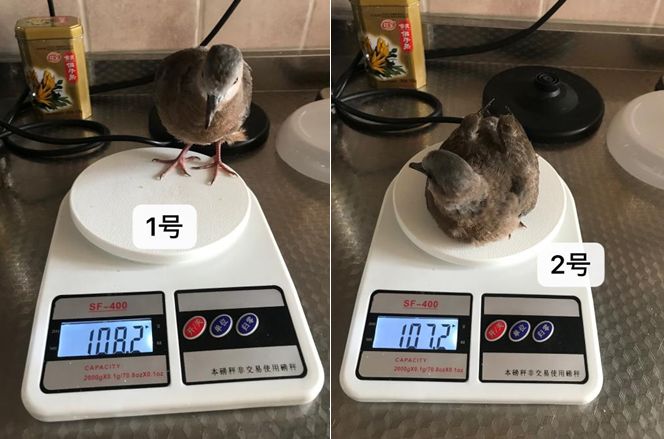 2号前期一直不会飞,脚也软,从尹军老师口中得知2号这是缺钙,我立马磨了保健砂和墨鱼骨粉,加水混合成糊糊,每天给2号灌0.5-1克。一连灌了5天,情况以肉眼可见的速度好转,直到6月11日,救助的第7天,2号已经可以飞了,虽然不如1号利索,能大气不喘地满屋子乱窜,但是飞个短距离再安全着陆已经没什么问题了。此时1号和2号不看尾羽上的白斑,已经隐约有点傻傻分不清啦~行为上,它们也逐渐开始接近成年的珠颈斑鸠,乞食的行为明显减少了,见了我也知道飞走躲开。