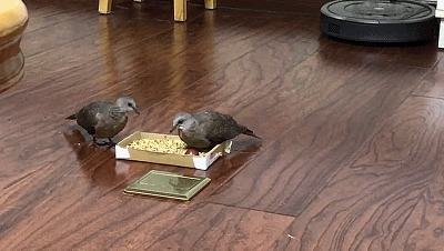 学会吃主食和飞行之后的短短三五天时间,两小只已经可以开始练习满地找食吃了,我撤掉了食盒和食盘,把保健砂和混合谷子洒在客厅、厨房的地板上,也洒在保育箱的木屑里,因为在野外,珠颈斑鸠常会在草地和乔木下拨草翻叶地觅食,所以在一堆杂物当中翻找食物也是必备技能,好在木屑是个合格的“教具”,所以这一课还是相当省心的。一天的时间两小只就学会翻找食物了。