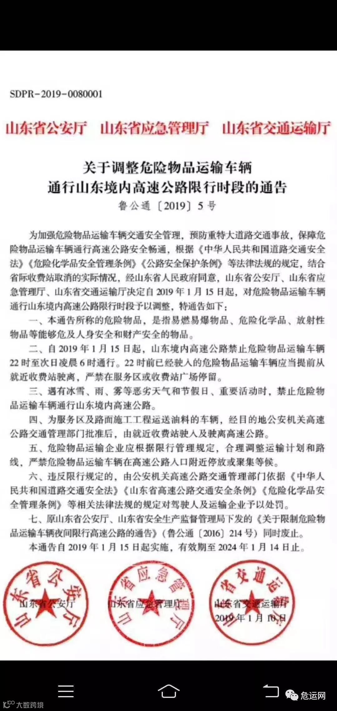 2019年1月15日起,山东省高速公路限行危化品运输车的时间有变: